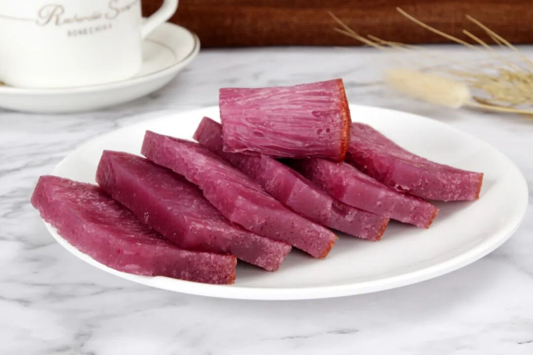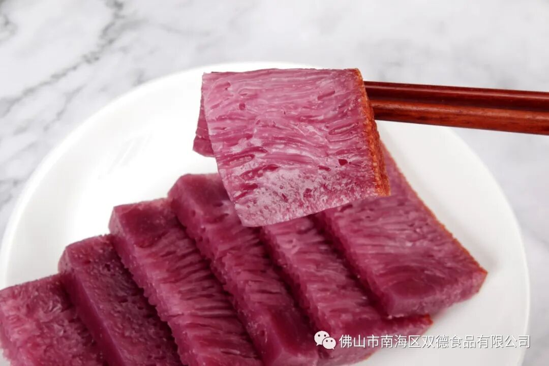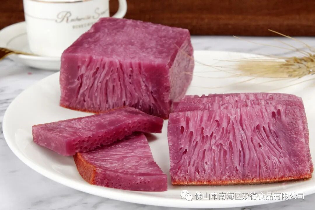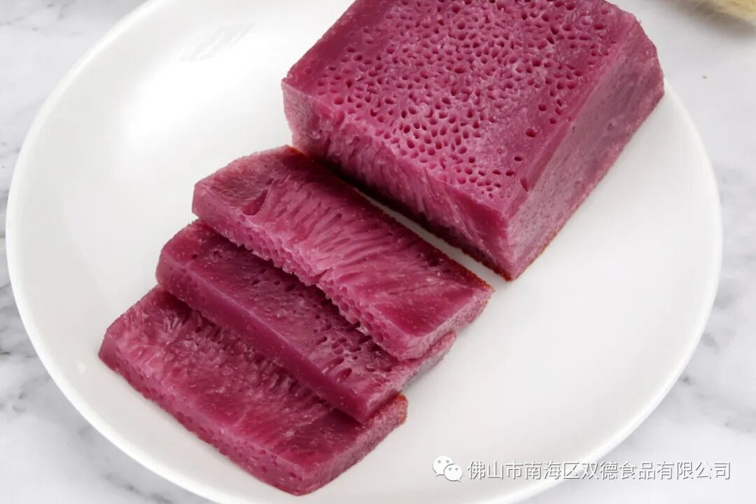 紫金糕口感香甜可口,Q弹不粘牙,作为早餐一道不错的糕点!它的正面可看到细密的蜂窝孔,切片面后细如鱼翅丝状,可以蒸或煎,但煎味道会更佳。